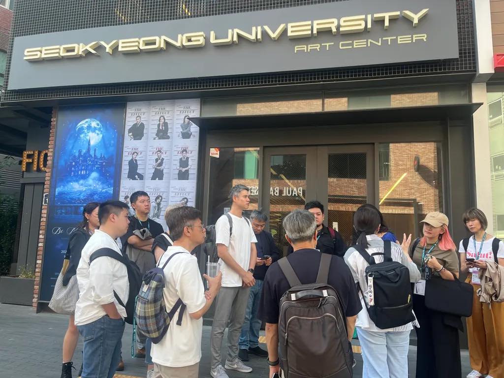 本次我們共走訪四座代表性場館與排練空間: 【Skon 西京大學表演藝術中心(서경대학교 공연예술센터)】 由西京大學建置營運,結合教學與產業實務,劇場位於惠化站 1 號出口旁,為一棟地上六層、地下六層的複合型建築。內含 Skon1館(440席)、Skon2館(260席)、Skon Music Hall、畫廊、排練場與 PIXELive 攝影棚等空間。劇場以租賃為主要營運模式,並計畫導入學生作品孵化機制。空間座椅寬敞、廁所數量友善女性觀眾,後台與舞台深度相較於大學路其他中小型劇場更為寬敞。唯一挑戰為卸貨系統,Skon2 館需倚靠雲梯車把舞台佈景和設備搬運至3樓,反映大學路地區普遍劇場空間的硬體限制。