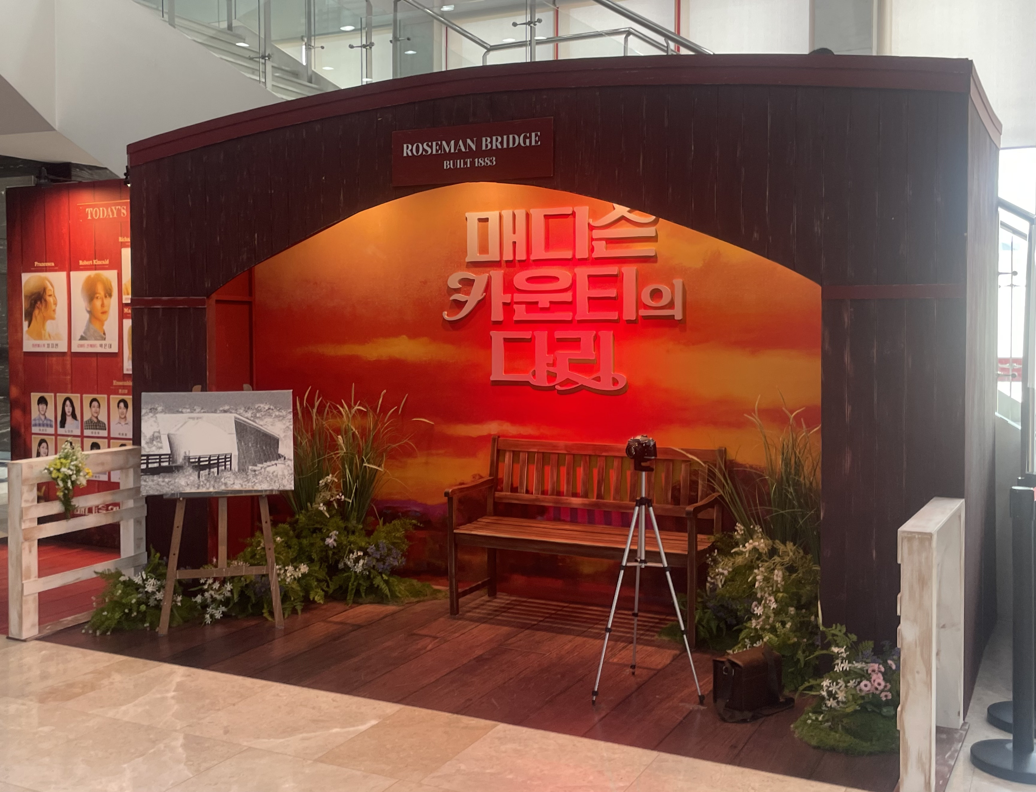 第二場為《麥迪遜之橋》(매디슨 카운티의 다리),於狎鷗亭站的BBCH光林藝術中心演出(998席)。狎鷗亭為首爾高端住宅與商業聚集區,國際版權製作也常在此劇院演出,觀眾族群與地區經濟可為相輔相成。本劇改編自同名小說,由Jason Robert Brown作曲,講述1960年代一位主婦Francesca與攝影師Robert短暫卻刻骨的四日戀情。由韓國一線演員趙貞恩 조정은 與崔載林최재림 主演,演唱實力與情感表現皆具水準。從舞台設計到周邊服務均展現大型製作的高完成度,許多觀眾在看戲後仍流連忘返,排隊與前台裝置合照,聊天分享心得和採購周邊,看戲前後亦成爲重要的社交場景。