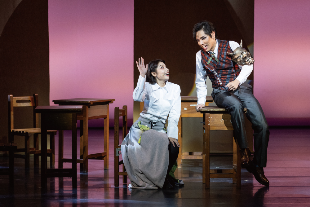 這次的編導組合——周玉軒與許栢昂——都與「戲曲」有密切關係。周玉軒過去編劇作品以戲曲為主,而許栢昂出身京劇演員,雖說其劇團「栢優座」較難、也無需刻意定義為戲曲團隊,特別是他過去多所開發的「當代戲曲程式」。因此,《鬼島學苑進修部》不僅是周玉軒第一部以「音樂劇」設定的售票作品,似乎也同樣在挑戰編導兩人可能的交集位置——當戲曲持續變體,音樂劇會不會是一個足以「統合」的形式?